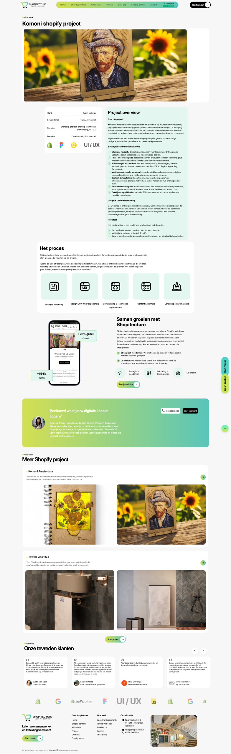 Voor Shopitecture ontwikkelde ConnectC een complete online merkbeleving. We begonnen met een krachtige branding en zetten deze door in het grafisch ontwerp van alle pagina’s. De website is opgebouwd in Webflow met optimale focus op UI/UX, waardoor bezoekers intuïtief en aangenaam kunnen navigeren.
